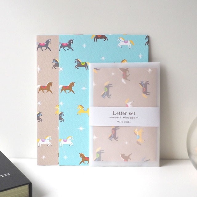 半透明のトレーシングペーパー封筒に 便箋の柄が透けて見えるユニークなレターセット 便箋紙が厚手のマーメイド紙で高級感があります (オプションで薄手の便箋も選択可能です) お馬さんが翔け回るちらし模様の柄です お色ブルーとベージュからお選びください 半々の組み合わせも可能です ファンレターやプレゼントに添える手紙にも最適 開封前からワクワクするレターセットです ★便箋や封筒の追加はオプションでお願いします 【セット内容】 ・便箋 × 4枚(紙厚選択可能) 厚目マーメイド紙:約0.26mm/薄いタイプの名刺程度 薄目マーメイド紙:約0.16mm/コピー用紙2枚重ね程度 ・封筒 × 2枚(トレーシングペーパー製) ・宛名シール × 2枚 【サイズ】 便箋 サイズ :150 mm × 210 mm 封筒 サイズ :115 mm × 160 mm(洋2) 宛名シールサイズ:98 mm × 55 mm (手作業で裁断するため多少の誤差があります) 【配送について】 クリックポスト :発送3日前後で郵便受けにお届け(一部地域除く)追跡あり レターパックライト:発送翌日郵便受けにお届け(一部地域除く)追跡あり