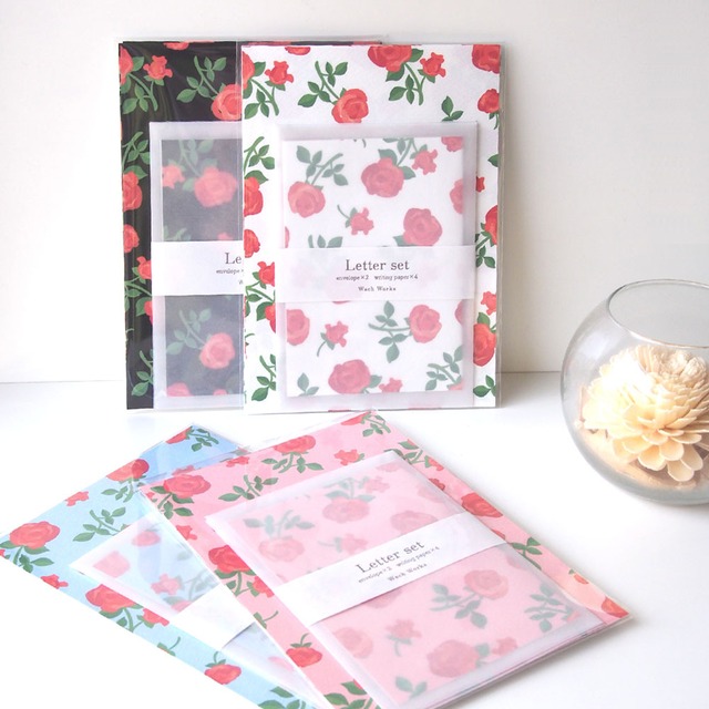 半透明のトレーシングペーパー封筒に便箋の 薔薇柄が透けて見えるユニークなレターセット 便箋紙は厚手で風合いの良いマーメイド紙で 高級感があり(便箋は薄手にも変更可能) 封筒や便箋の枚数追加もオプション対応できます パッと見に目立つ手紙は推し活にピッタリ 花束やプレゼントに添える手紙にも! 【セット内容】 ・便箋 × 4枚(紙厚選択可能) 厚目マーメイド紙:約0.26mm/薄いタイプの名刺程度 薄目マーメイド紙:約0.16mm/コピー用紙2枚重ね程度 ・封筒 × 2枚(トレーシングペーパー製) ・宛名シール × 2枚 【サイズ】 便箋 サイズ :150 mm × 210 mm 封筒 サイズ :115 mm × 160 mm(洋2) 宛名シールサイズ:98 mm × 55 mm (手作業で裁断するため多少の誤差があります) 【配送について】 クリックポスト :発送3日前後で郵便受けにお届け(一部地域除く)追跡あり レターパックライト:発送翌日郵便受けにお届け(一部地域除く)追跡あり