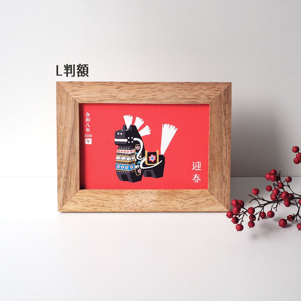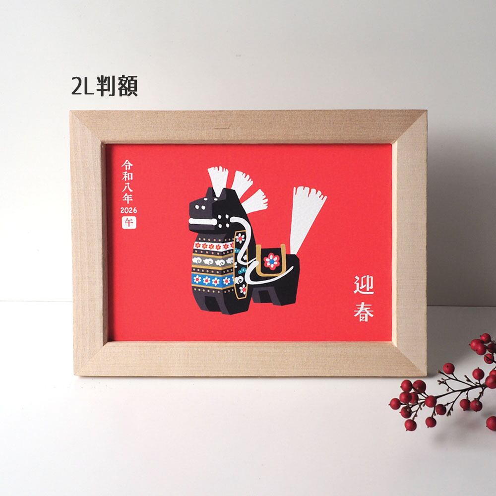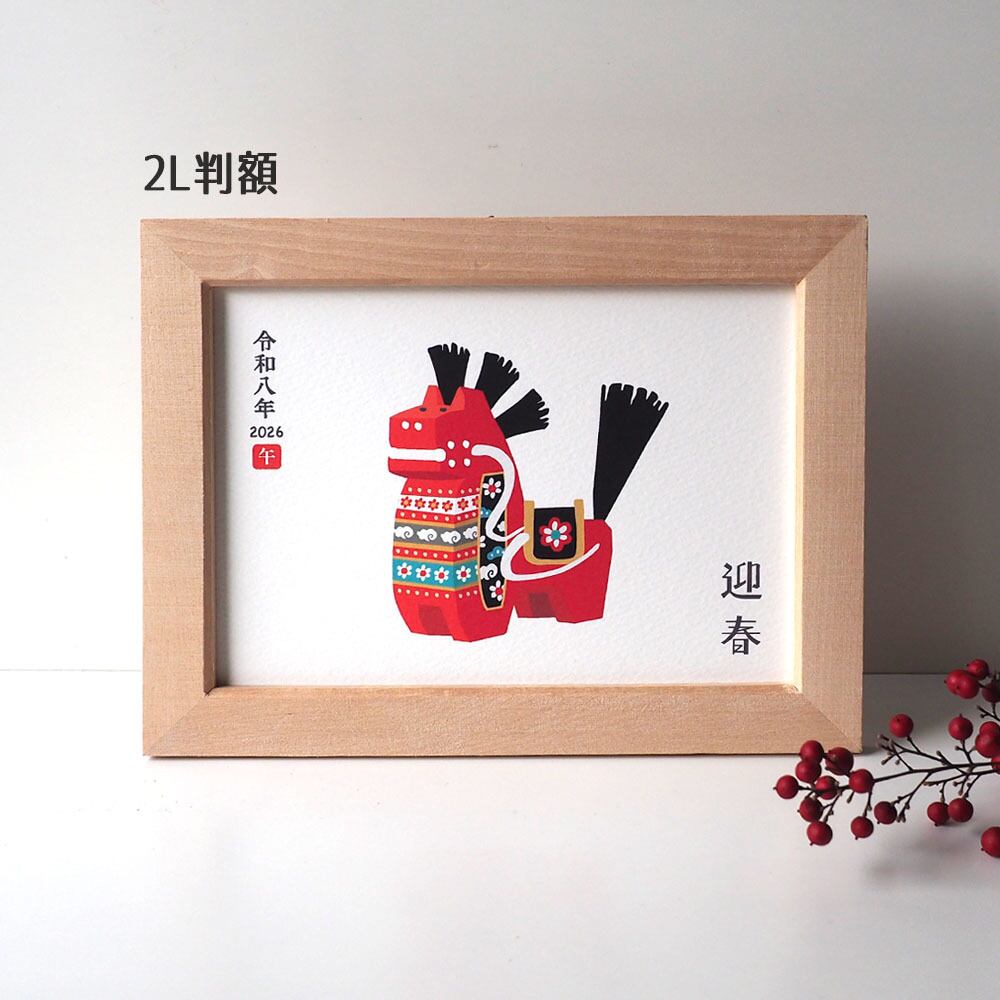 L判と2L判サイズが選べるお正月飾り午年の額入りイラストです