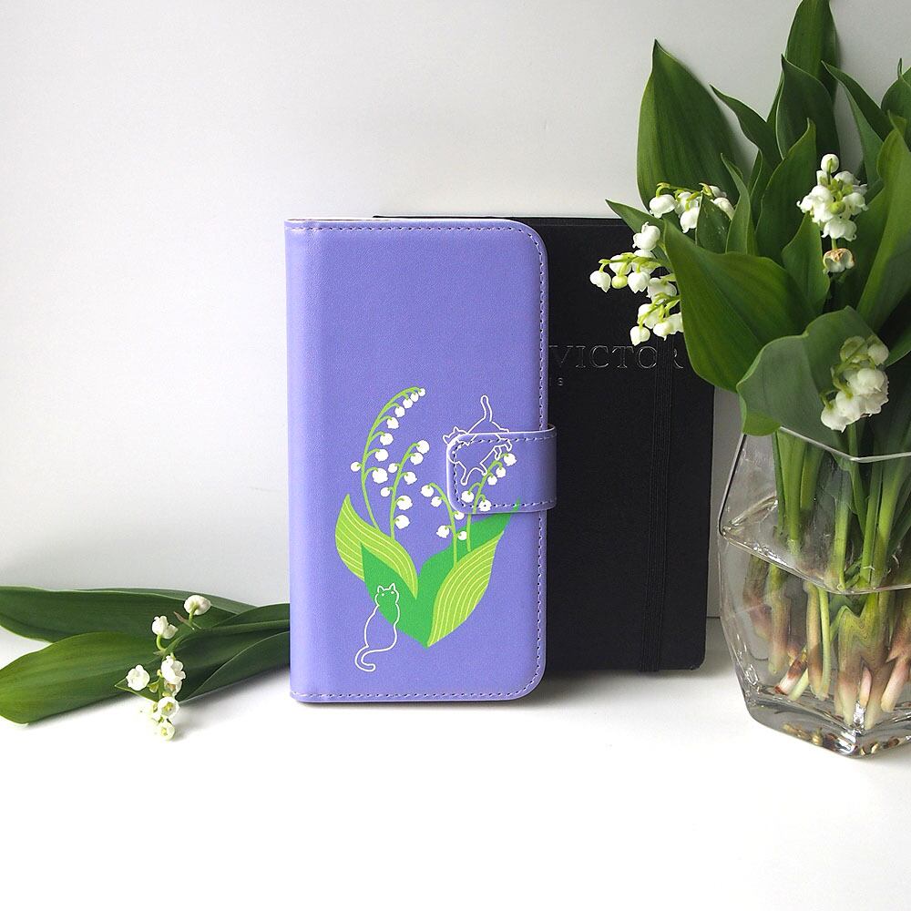 幸福の花・鈴蘭と猫の手帳型スマホケース