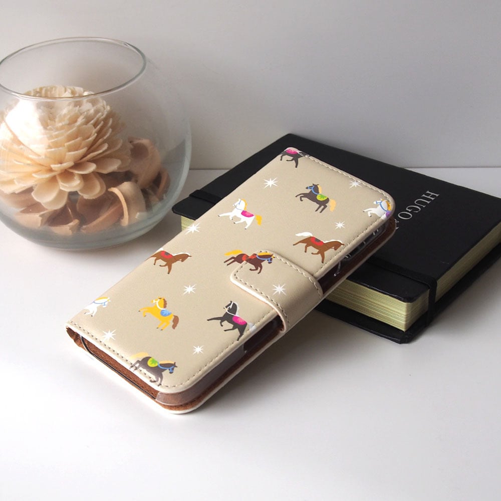 お馬さんが翔け回るちらし模様の手帳型スマホケースです。