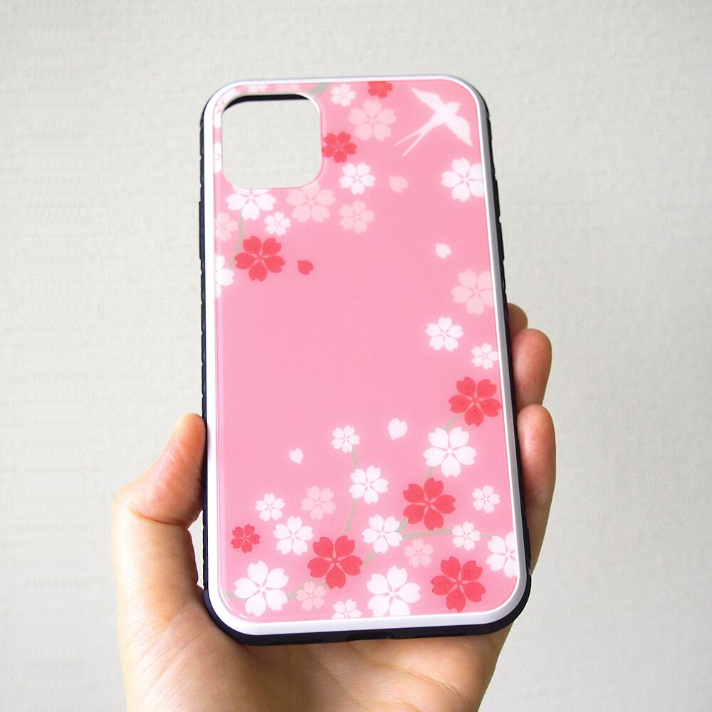 桜咲く春にツバメが舞う柄の強化ガラスのスマホケース。