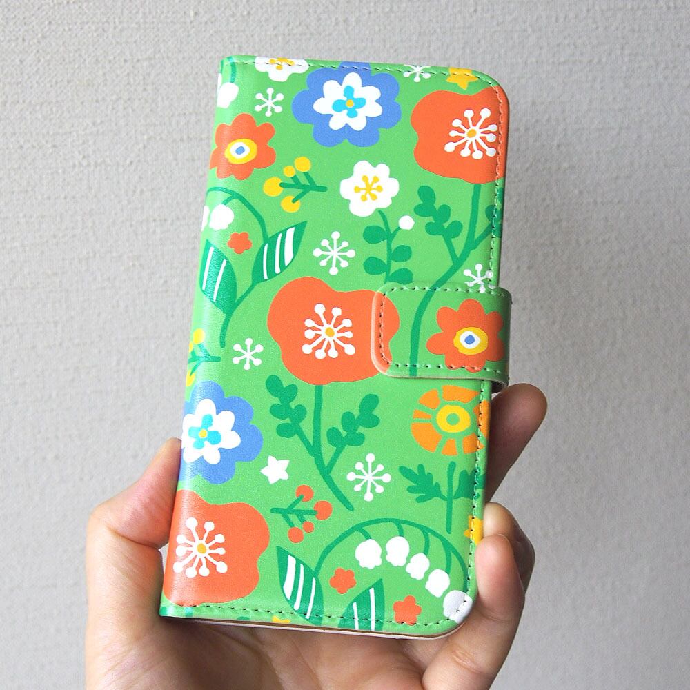 素朴な花柄が可愛い鮮やかなライムグリーンベースの手帳型スマホケースです。