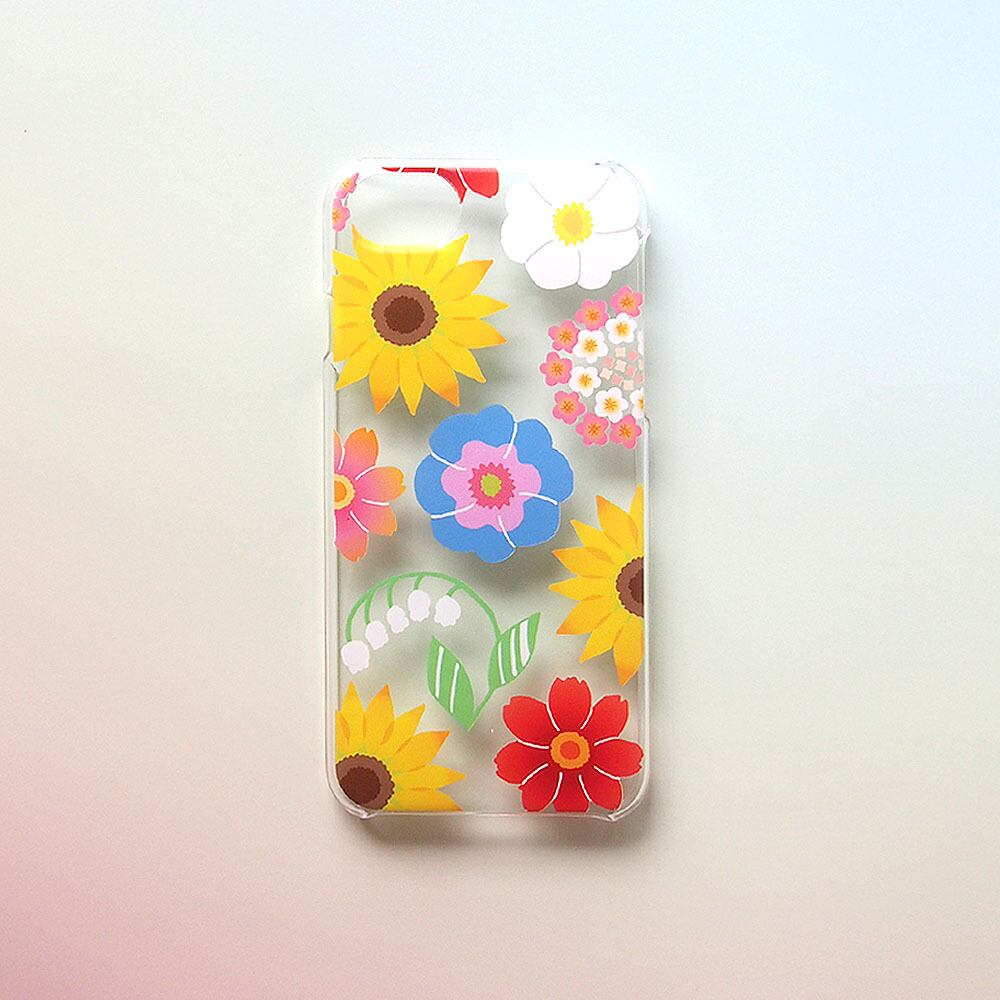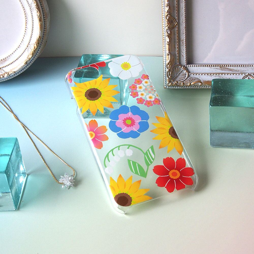 ひまわり、ヒメシャラ、ランタナ、ジニア、鈴蘭、華やかな夏の花々をあつめたクリアスマホケースです。