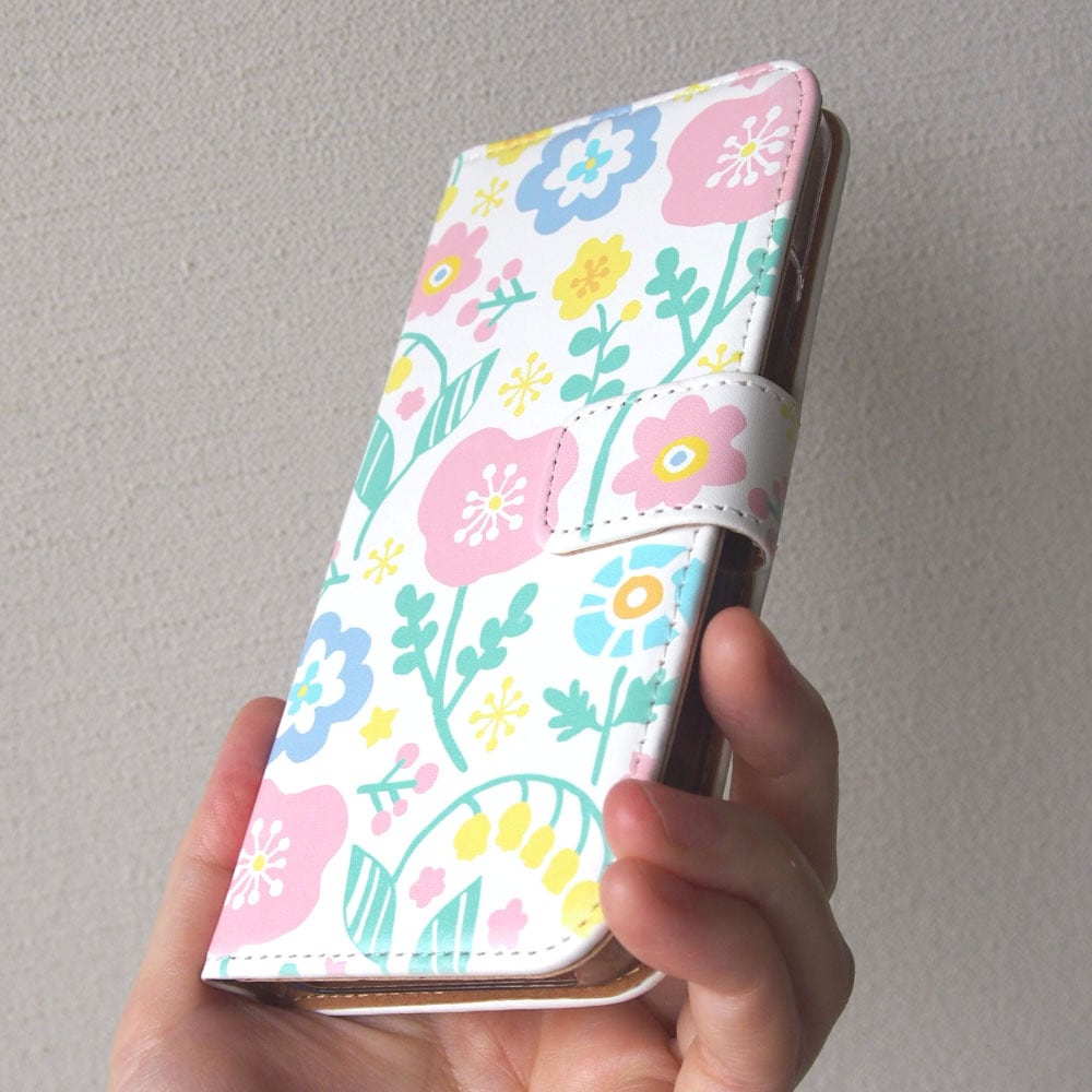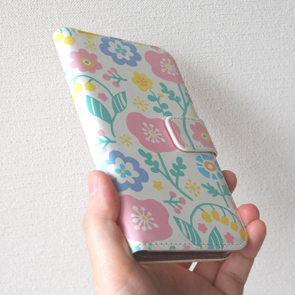 春を待つ気持ちを詰め込んだかのようなパステルカラーの手描きの花柄が素朴で可愛い手帳型スマホケースです。
