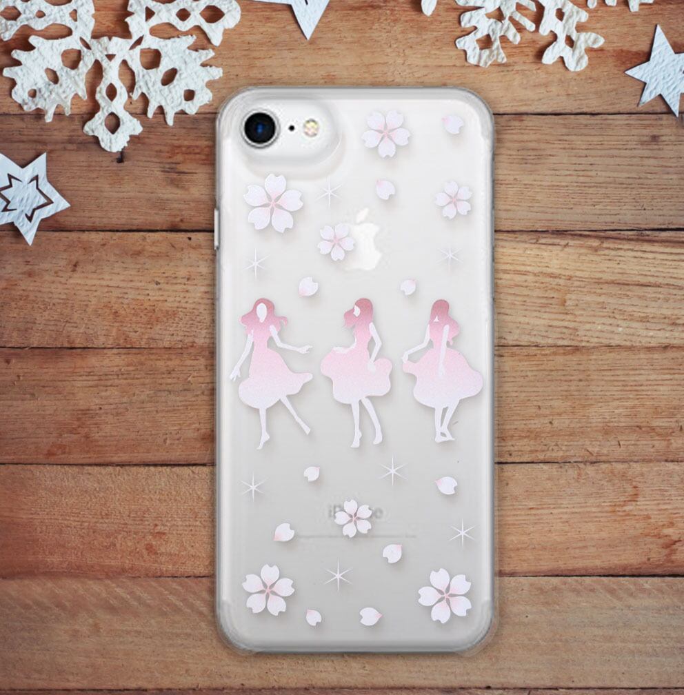 桜と共に舞う女の子のシルエットがスマホに映えるクリアスマホケースです。
