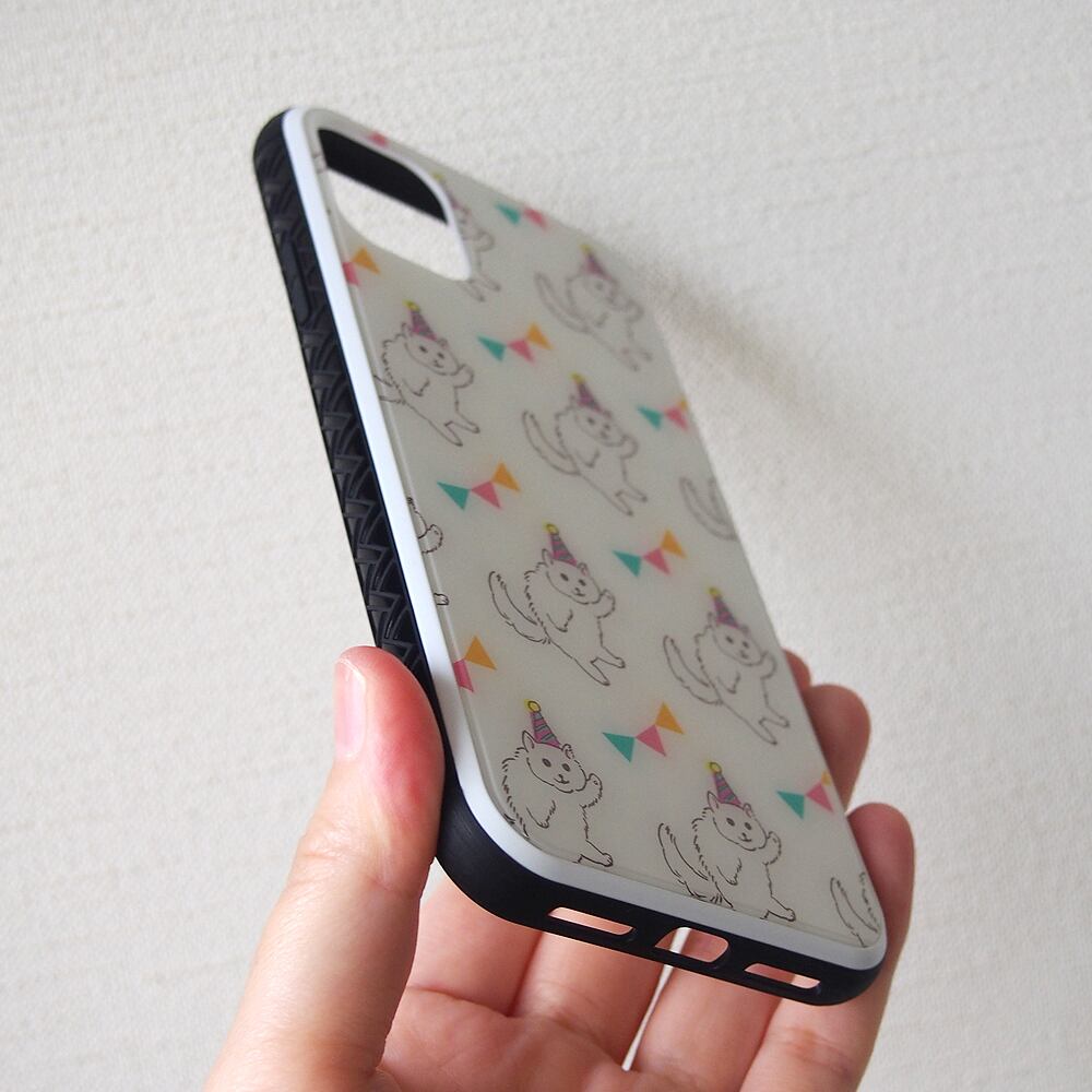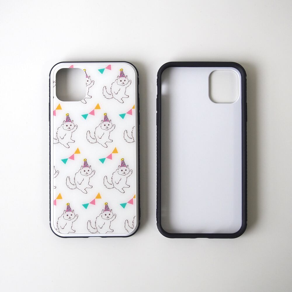 パーティーではしゃぐ猫の並ぶ柄が可愛らしい強化ガラスのスマホケース。