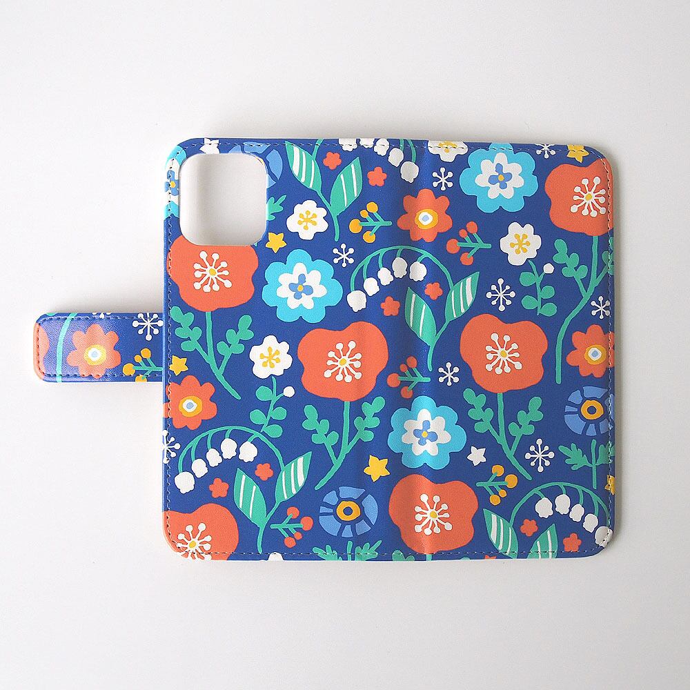 素朴な花柄が可愛い鮮やかなネイビーベースの手帳型スマホケースです。