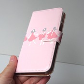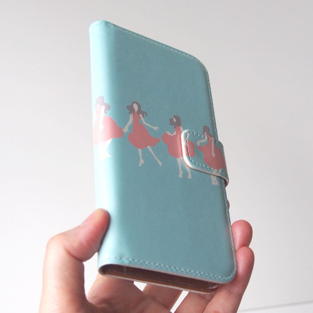 ひらひらとスカートを翻して女性が踊っているようなイラストがパステルカラーに映える手帳型スマホケースです。