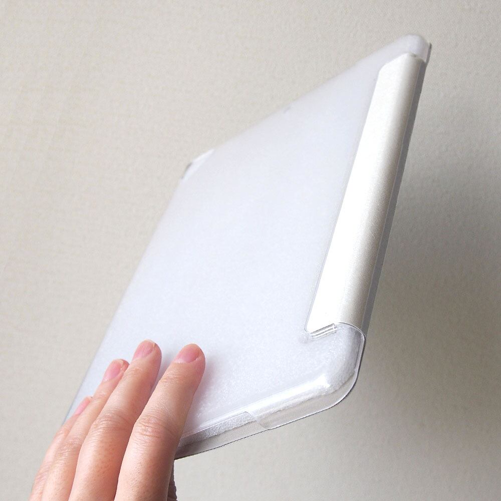 三つ折りカバーは軽量で丈夫な手に馴染むPUレザー、本体を保護するハードケースは半透明のポリカーボネート製です。
