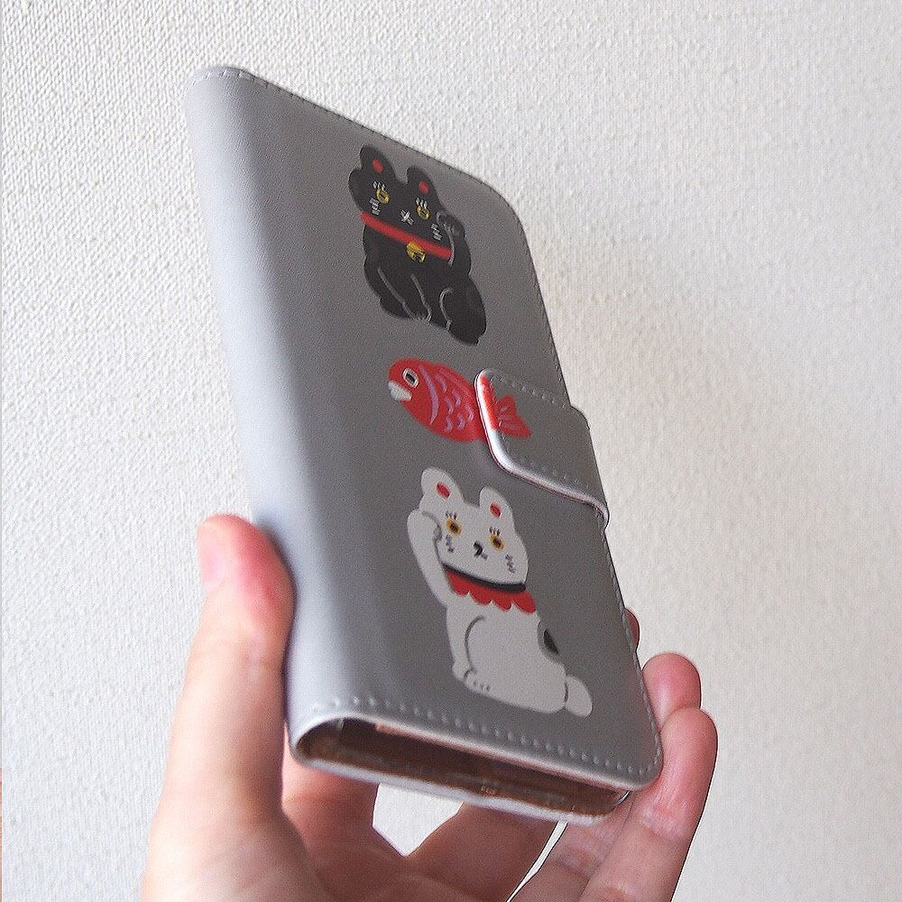 白黒の招き猫が素朴で愛らしい手帳型スマホケースです。