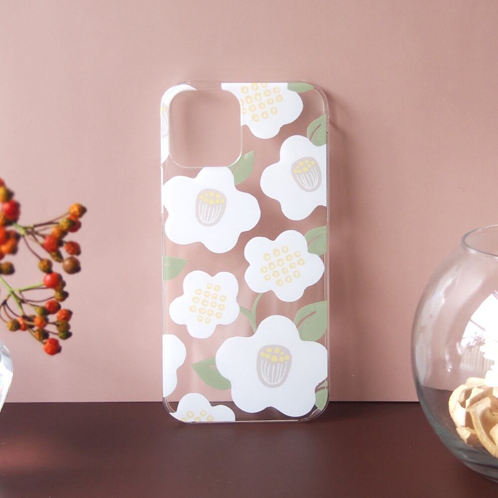 和モダンな白い椿の花がレトロ可愛いクリアスマホケースです。