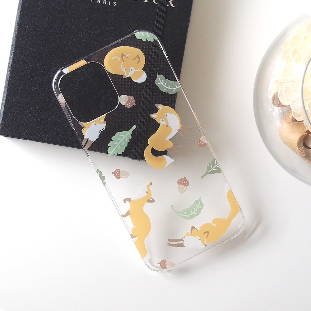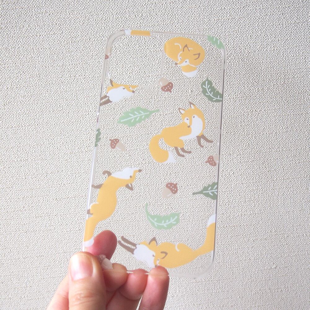 実りの季節に喜んで冬じたくを始めるキツネさんのクリアスマホケースです。