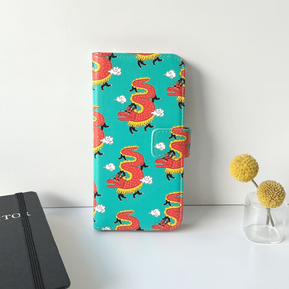 とぼけた表情が可愛らしい、縁起の良い龍踊り柄の手帳型スマホケースです。