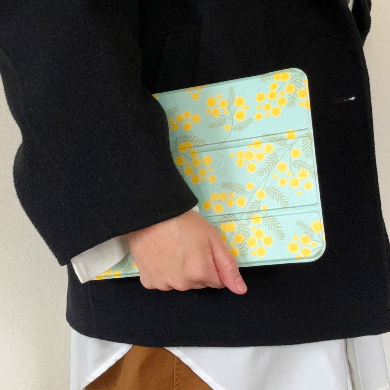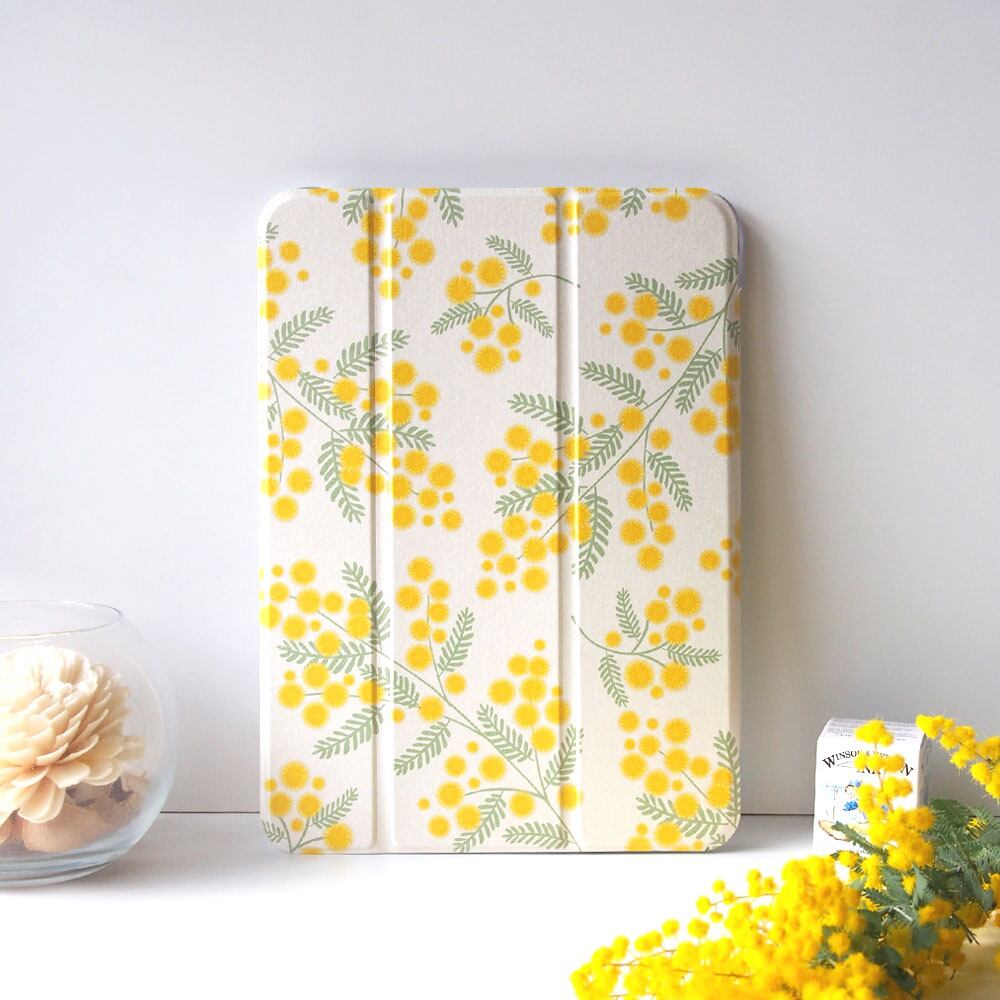 春先にフワフワの黄色い房状の花を咲かせるミモザ(アカシア)柄の、三つ折り手帳型プラケースタイプのiPadケースです。