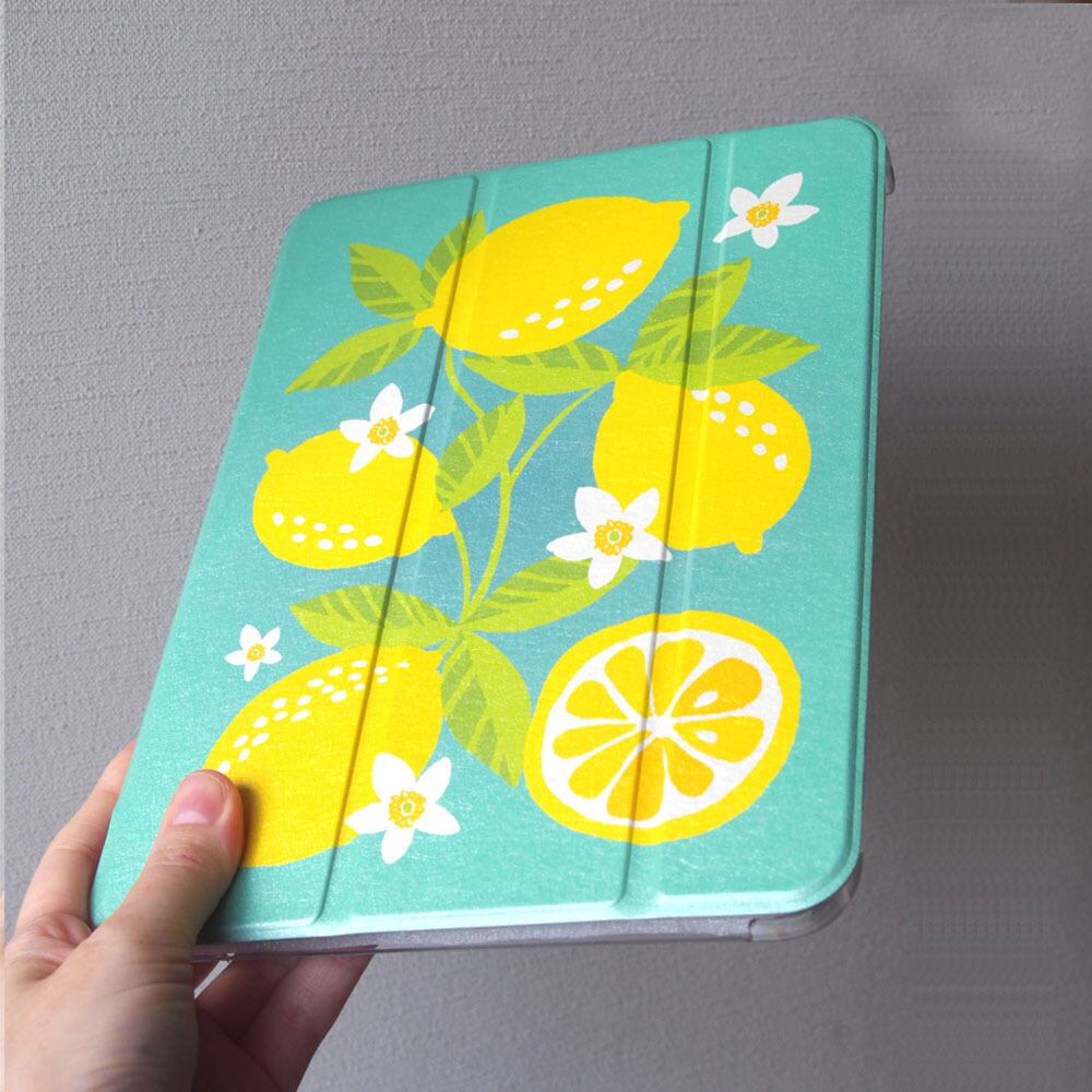 ペン収納付手帳型iPadケース【レモン模様】三折りスタンド機能付ソフトケースタイプ