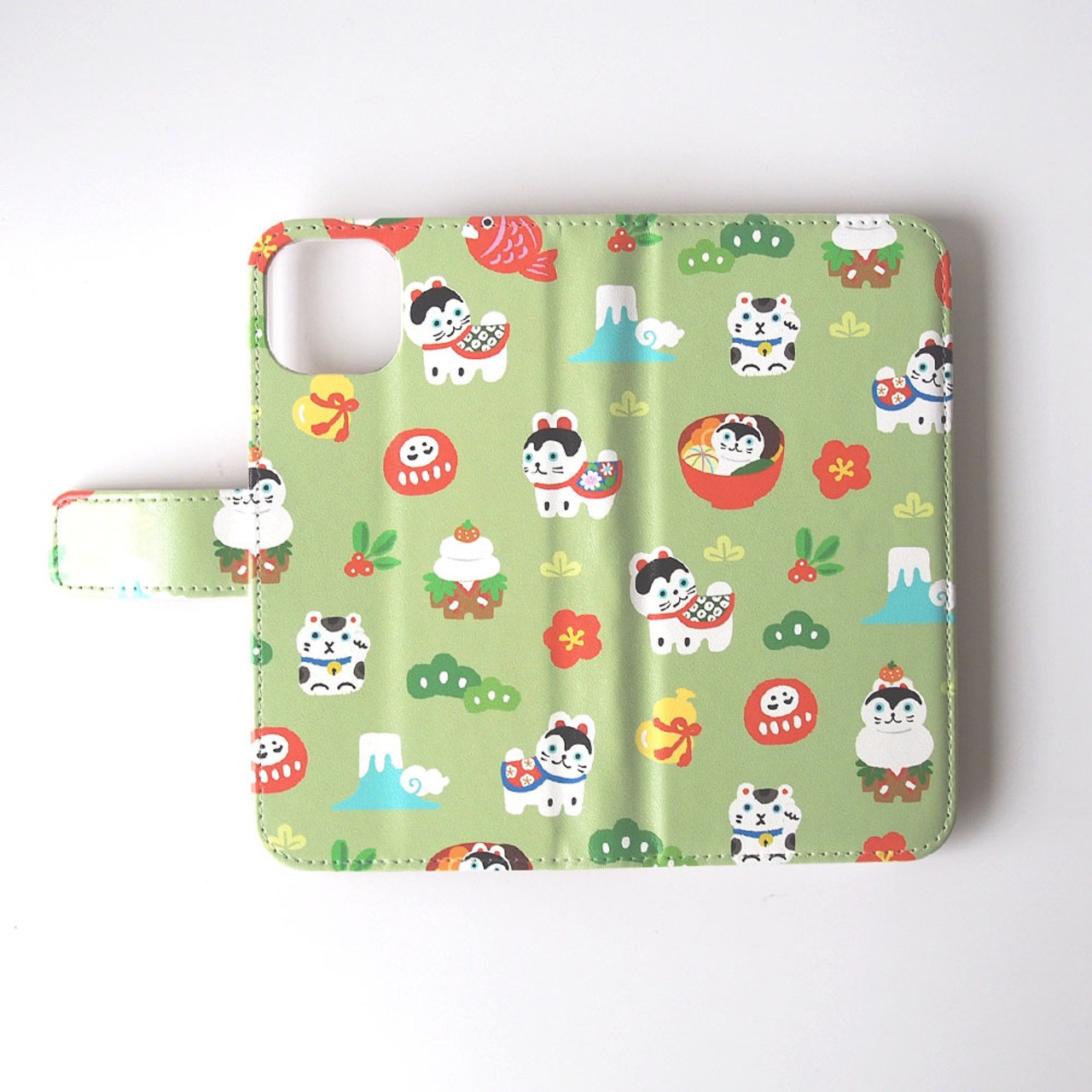 張子犬と縁起物づくしの手帳型スマホケースです。