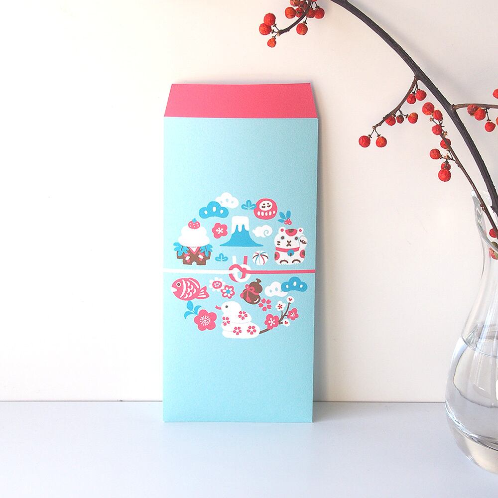 お正月の縁起物の並ぶ柄が巳年にぴったりの万型お祝い袋です
